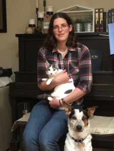 She currently shares her home (and everything else) with River, a Texas heeler, and Pebble, a very small cat with dog software.